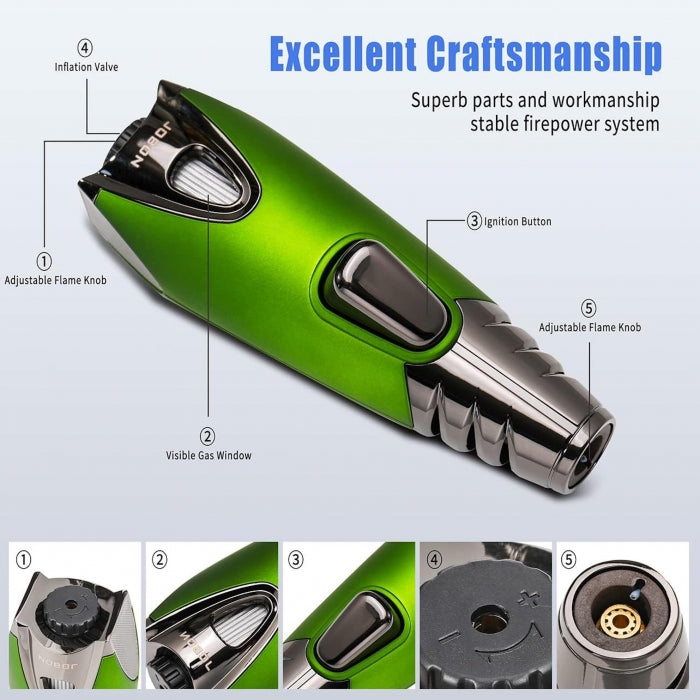 This Jobon rocket single jet lighter features a high-temperature, windproof flame. It is ideal for lighting cigars, cigarettes, moxibustion, hair removal, and outdoor activities like camping and hiking. Its ergonomic design includes a comfortable grip and a visible gas window for easy monitoring.